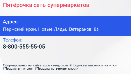 Пятёрочка, сеть супермаркетов по адресу Пермский край, Новые Ляды, Ветеранов, 8а в дальнейшем Организация, размещена в следующих категориях: