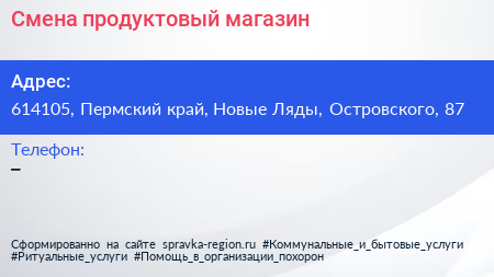 Смена, продуктовый магазин по адресу 614105, Пермский край, Новые Ляды, Островского, 87 в дальнейшем Организация, размещена в следующих категориях:
