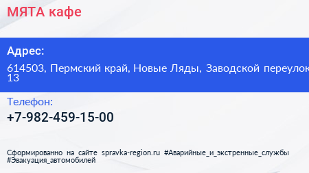 МЯТА, кафе по адресу 614503, Пермский край, Новые Ляды, Заводской переулок, 13 в дальнейшем Организация, размещена в следующих категориях: