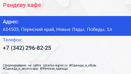 Рандеву, кафе по адресу 614503, Пермский край, Новые Ляды, Победы, 1л в дальнейшем Организация, размещена в следующих категориях: