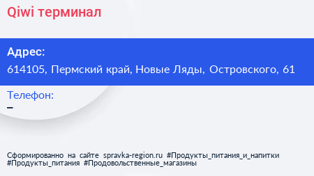 Qiwi, терминал по адресу 614105, Пермский край, Новые Ляды, Островского, 61 в дальнейшем Организация, размещена в следующих категориях: