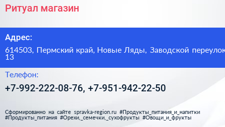 Ритуал, магазин по адресу 614503, Пермский край, Новые Ляды, Заводской переулок, 13 в дальнейшем Организация, размещена в следующих категориях: