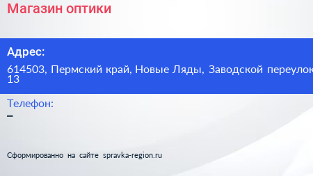 Магазин оптики по адресу 614503, Пермский край, Новые Ляды, Заводской переулок, 13 в дальнейшем Организация, размещена в следующих категориях: