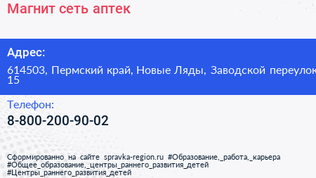 Магнит, сеть аптек по адресу 614503, Пермский край, Новые Ляды, Заводской переулок, 15 в дальнейшем Организация, размещена в следующих категориях: