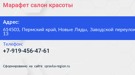 Марафет, салон красоты по адресу 614503, Пермский край, Новые Ляды, Заводской переулок, 13 в дальнейшем Организация, размещена в следующих категориях:
