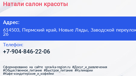 Натали, салон красоты по адресу 614503, Пермский край, Новые Ляды, Заводской переулок, 26 в дальнейшем Организация, размещена в следующих категориях: