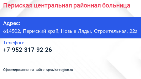 Пермская центральная районная больница по адресу 614502, Пермский край, Новые Ляды, Строительная, 22а в дальнейшем Организация, размещена в следующих категориях:
