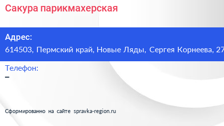 Сакура, парикмахерская по адресу 614503, Пермский край, Новые Ляды, Сергея Корнеева, 27 в дальнейшем Организация, размещена в следующих категориях: