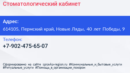 Стоматологический кабинет по адресу 614105, Пермский край, Новые Ляды, 40 лет Победы, 9 в дальнейшем Организация, размещена в следующих категориях: