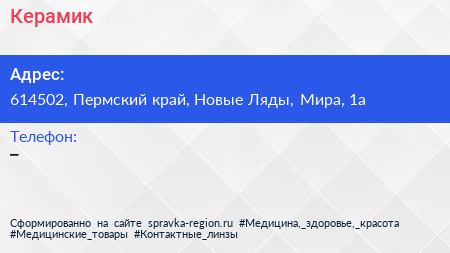 Керамик по адресу 614502, Пермский край, Новые Ляды, Мира, 1а в дальнейшем Организация, размещена в следующих категориях: