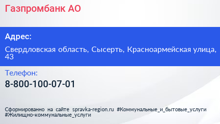 Газпромбанк, АО по адресу Свердловская область, Сысерть, Красноармейская улица, 43 в дальнейшем Организация, размещена в следующих категориях:
