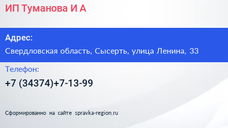 ИП Туманова И.А. по адресу Свердловская область, Сысерть, улица Ленина, 33 в дальнейшем Организация, размещена в следующих категориях: