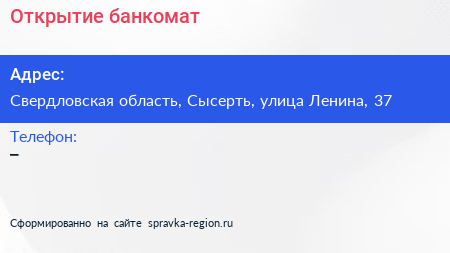 Открытие, банкомат по адресу Свердловская область, Сысерть, улица Ленина, 37 в дальнейшем Организация, размещена в следующих категориях: