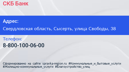 СКБ-Банк по адресу Свердловская область, Сысерть, улица Свободы, 38 в дальнейшем Организация, размещена в следующих категориях: