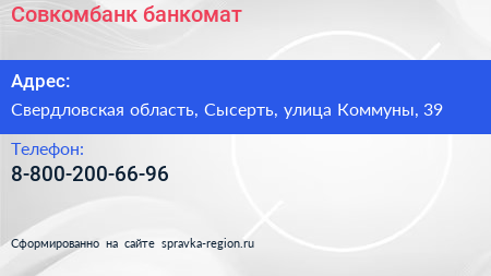 Совкомбанк, банкомат по адресу Свердловская область, Сысерть, улица Коммуны, 39 в дальнейшем Организация, размещена в следующих категориях: