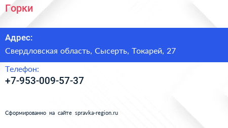 Горки по адресу Свердловская область, Сысерть, Токарей, 27 в дальнейшем Организация, размещена в следующих категориях:
