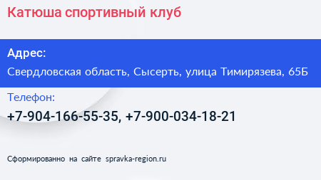 Катюша, спортивный клуб по адресу Свердловская область, Сысерть, улица Тимирязева, 65Б в дальнейшем Организация, размещена в следующих категориях: