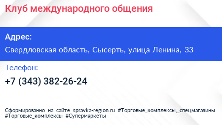 Клуб международного общения по адресу Свердловская область, Сысерть, улица Ленина, 33 в дальнейшем Организация, размещена в следующих категориях: