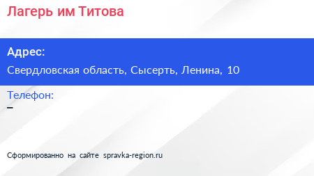 Лагерь им.Титова по адресу Свердловская область, Сысерть, Ленина, 10 в дальнейшем Организация, размещена в следующих категориях: