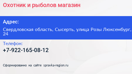 Охотник и рыболов, магазин по адресу Свердловская область, Сысерть, улица Розы Люксембург, 24 в дальнейшем Организация, размещена в следующих категориях: