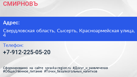 СМИРНОВЪ по адресу Свердловская область, Сысерть, Красноармейская улица, 4 в дальнейшем Организация, размещена в следующих категориях: