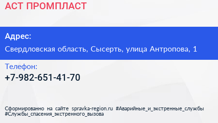 АСТ ПРОМПЛАСТ по адресу Свердловская область, Сысерть, улица Антропова, 1 в дальнейшем Организация, размещена в следующих категориях: