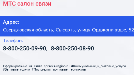 МТС, салон связи по адресу Свердловская область, Сысерть, улица Орджоникидзе, 52 в дальнейшем Организация, размещена в следующих категориях: