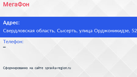 МегаФон по адресу Свердловская область, Сысерть, улица Орджоникидзе, 52 в дальнейшем Организация, размещена в следующих категориях: