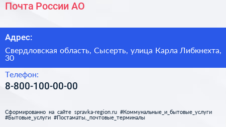 Почта России, АО по адресу Свердловская область, Сысерть, улица Карла Либкнехта, 30 в дальнейшем Организация, размещена в следующих категориях: