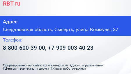 RBT.ru по адресу Свердловская область, Сысерть, улица Коммуны, 37 в дальнейшем Организация, размещена в следующих категориях: