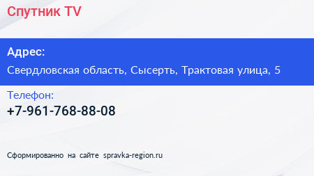 Спутник TV по адресу Свердловская область, Сысерть, Трактовая улица, 5 в дальнейшем Организация, размещена в следующих категориях: