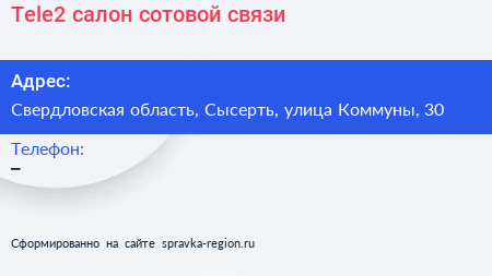 Tele2, салон сотовой связи по адресу Свердловская область, Сысерть, улица Коммуны, 30 в дальнейшем Организация, размещена в следующих категориях: