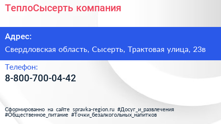 ТеплоСысерть, компания по адресу Свердловская область, Сысерть, Трактовая улица, 23в в дальнейшем Организация, размещена в следующих категориях: