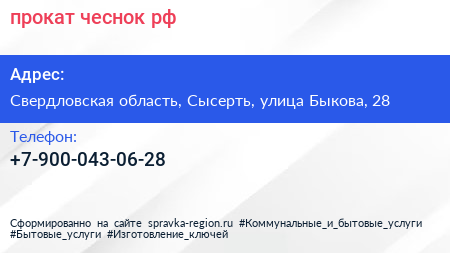 прокат-чеснок.рф по адресу Свердловская область, Сысерть, улица Быкова, 28 в дальнейшем Организация, размещена в следующих категориях: