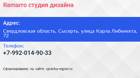 Ramarro, студия дизайна по адресу Свердловская область, Сысерть, улица Карла Либкнехта, 72 в дальнейшем Организация, размещена в следующих категориях: