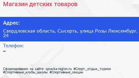 Магазин детских товаров по адресу Свердловская область, Сысерть, улица Розы Люксембург, 24 в дальнейшем Организация, размещена в следующих категориях: