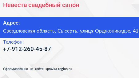 Невеста, свадебный салон по адресу Свердловская область, Сысерть, улица Орджоникидзе, 41 в дальнейшем Организация, размещена в следующих категориях: