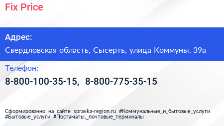 Fix Price по адресу Свердловская область, Сысерть, улица Коммуны, 39а в дальнейшем Организация, размещена в следующих категориях: