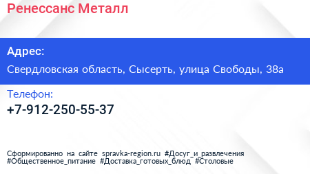 Ренессанс-Металл по адресу Свердловская область, Сысерть, улица Свободы, 38а в дальнейшем Организация, размещена в следующих категориях: