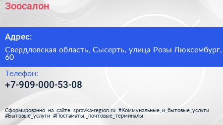 Зоосалон по адресу Свердловская область, Сысерть, улица Розы Люксембург, 60 в дальнейшем Организация, размещена в следующих категориях: