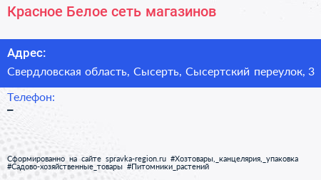 Красное & Белое, сеть магазинов по адресу Свердловская область, Сысерть, Сысертский переулок, 3 в дальнейшем Организация, размещена в следующих категориях: