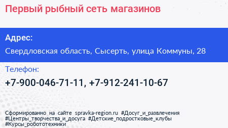 Первый рыбный, сеть магазинов по адресу Свердловская область, Сысерть, улица Коммуны, 28 в дальнейшем Организация, размещена в следующих категориях: