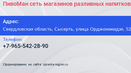 ПивоМан, сеть магазинов разливных напитков по адресу Свердловская область, Сысерть, улица Орджоникидзе, 52 в дальнейшем Организация, размещена в следующих категориях: