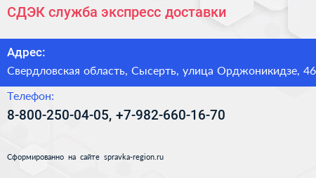 СДЭК, служба экспресс-доставки по адресу Свердловская область, Сысерть, улица Орджоникидзе, 46 в дальнейшем Организация, размещена в следующих категориях: