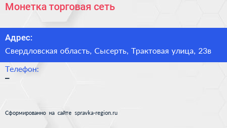 Монетка, торговая сеть по адресу Свердловская область, Сысерть, Трактовая улица, 23в в дальнейшем Организация, размещена в следующих категориях: