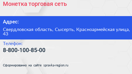 Монетка, торговая сеть по адресу Свердловская область, Сысерть, Красноармейская улица, 43 в дальнейшем Организация, размещена в следующих категориях: