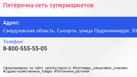 Пятёрочка, сеть супермаркетов по адресу Свердловская область, Сысерть, улица Орджоникидзе, 50 в дальнейшем Организация, размещена в следующих категориях: