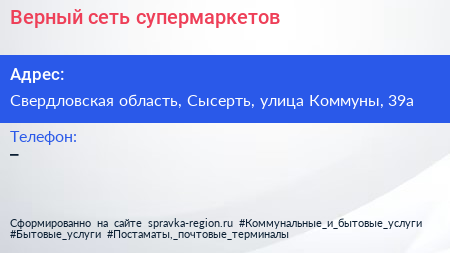 Верный, сеть супермаркетов по адресу Свердловская область, Сысерть, улица Коммуны, 39а в дальнейшем Организация, размещена в следующих категориях:
