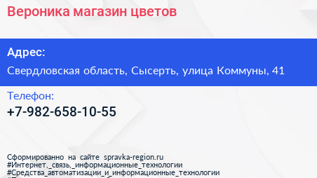 Вероника, магазин цветов по адресу Свердловская область, Сысерть, улица Коммуны, 41 в дальнейшем Организация, размещена в следующих категориях: