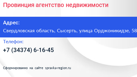 Провинция, агентство недвижимости по адресу Свердловская область, Сысерть, улица Орджоникидзе, 58 в дальнейшем Организация, размещена в следующих категориях: